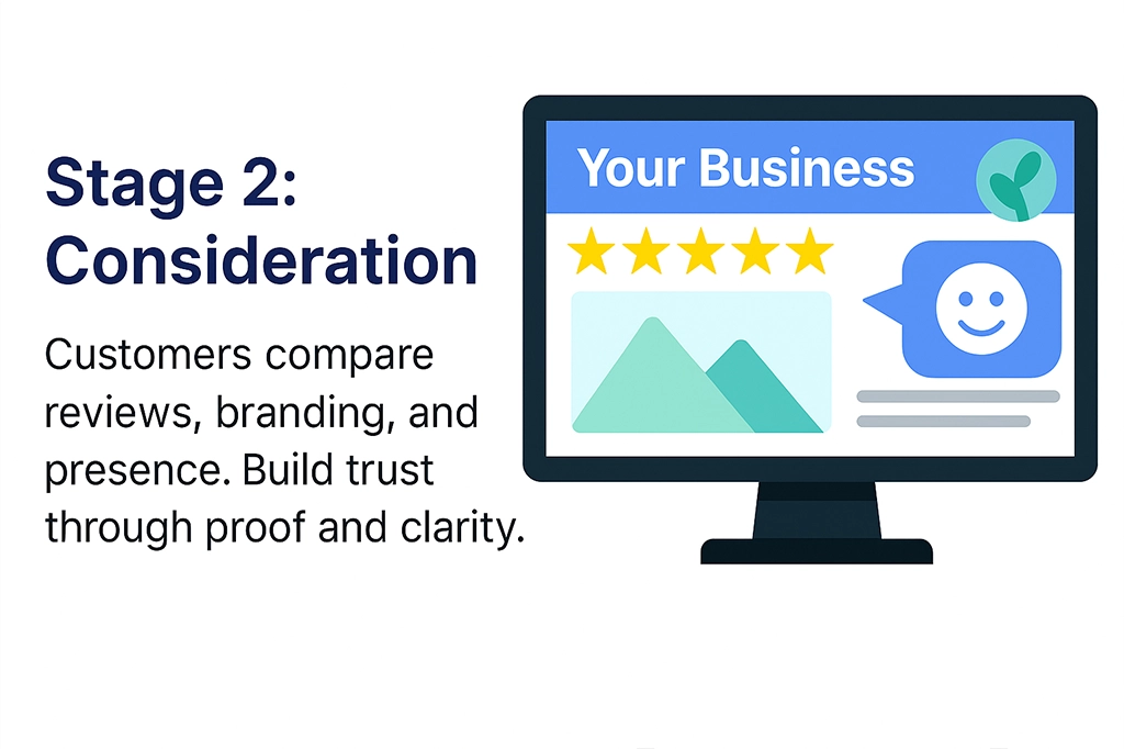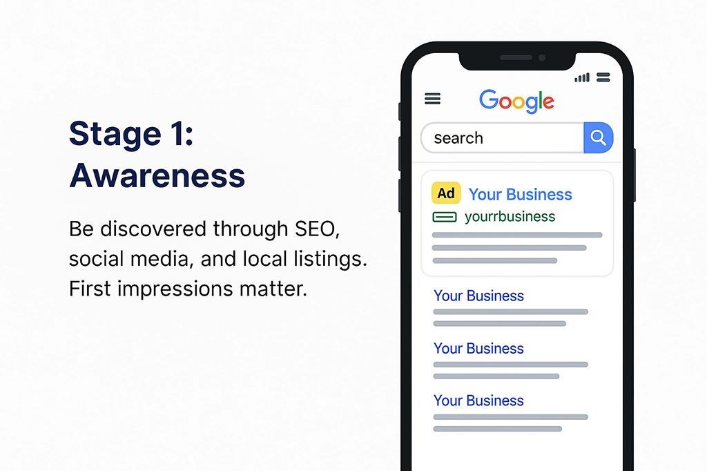 The customer becomes aware of your business — usually through search engines, social media, digital ads, or word of mouth.